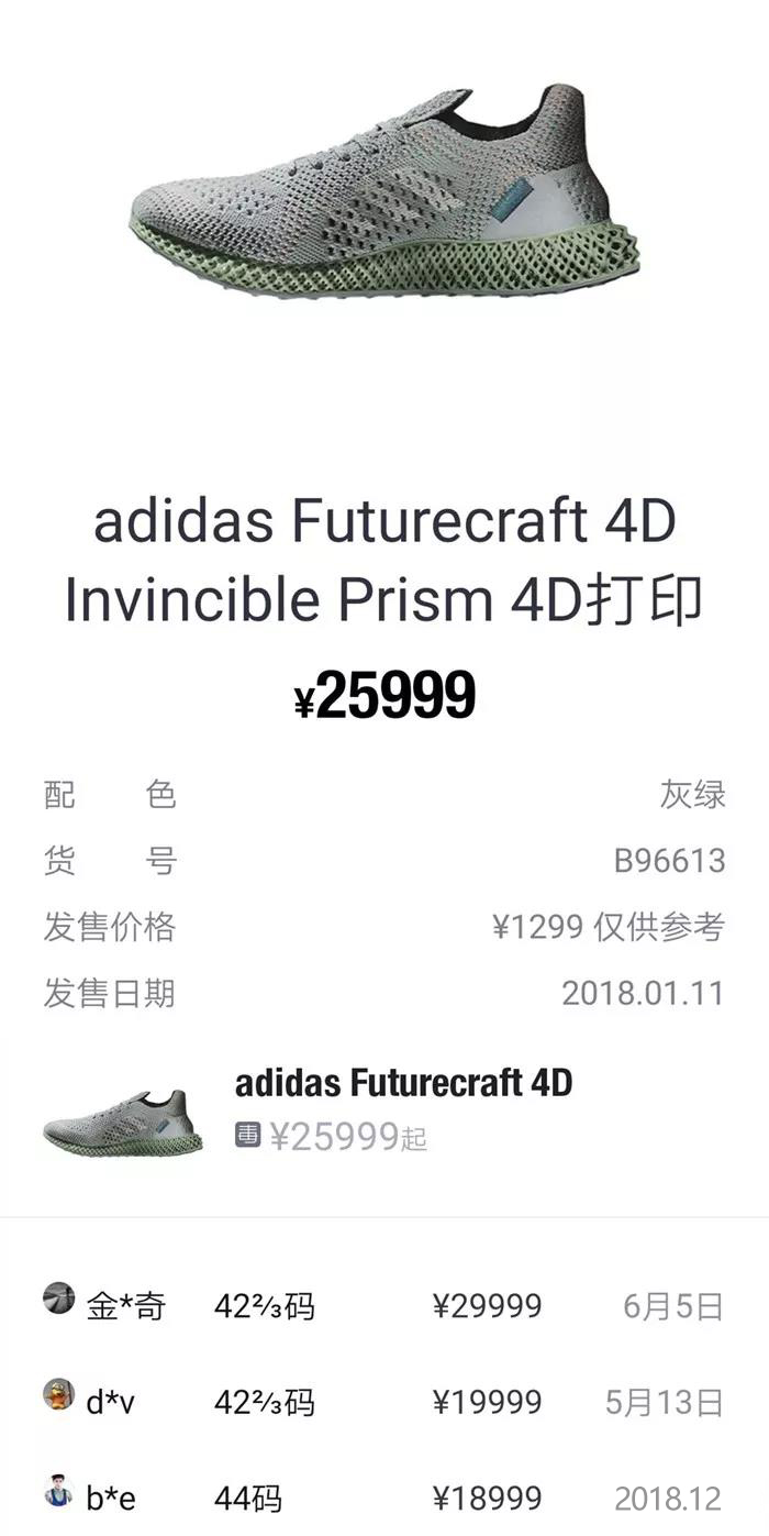 2018年1月上市的Adidas Futurecraft 4D Invincible Prism灰绿版本,竟然土豪玩家被炒到最高29999元。