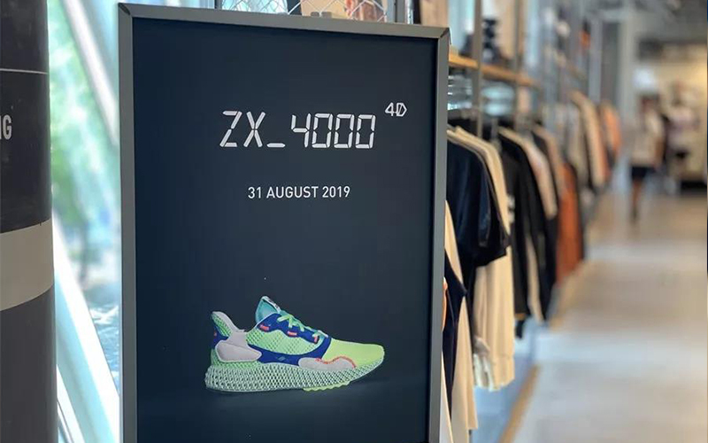 标价2799元的ZX_4000 4D,摆在门店里非常中心显眼的位置。采用adidas 4D数码式3D打印中底,营造科技感;采用adidas Primeknit鞋面,自然舒适。现场店员告诉南极熊,鞋中底打印的时间需要24小时。