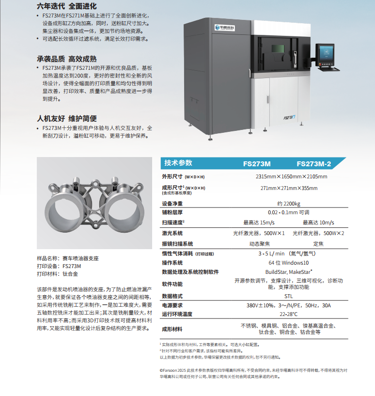 FS273M在FS271M基础上进行了全面创新进化,设备成形缸Z方向加高,同时,送粉缸尺寸加大。集尘器和设备集成一体,更加节约场地资源。